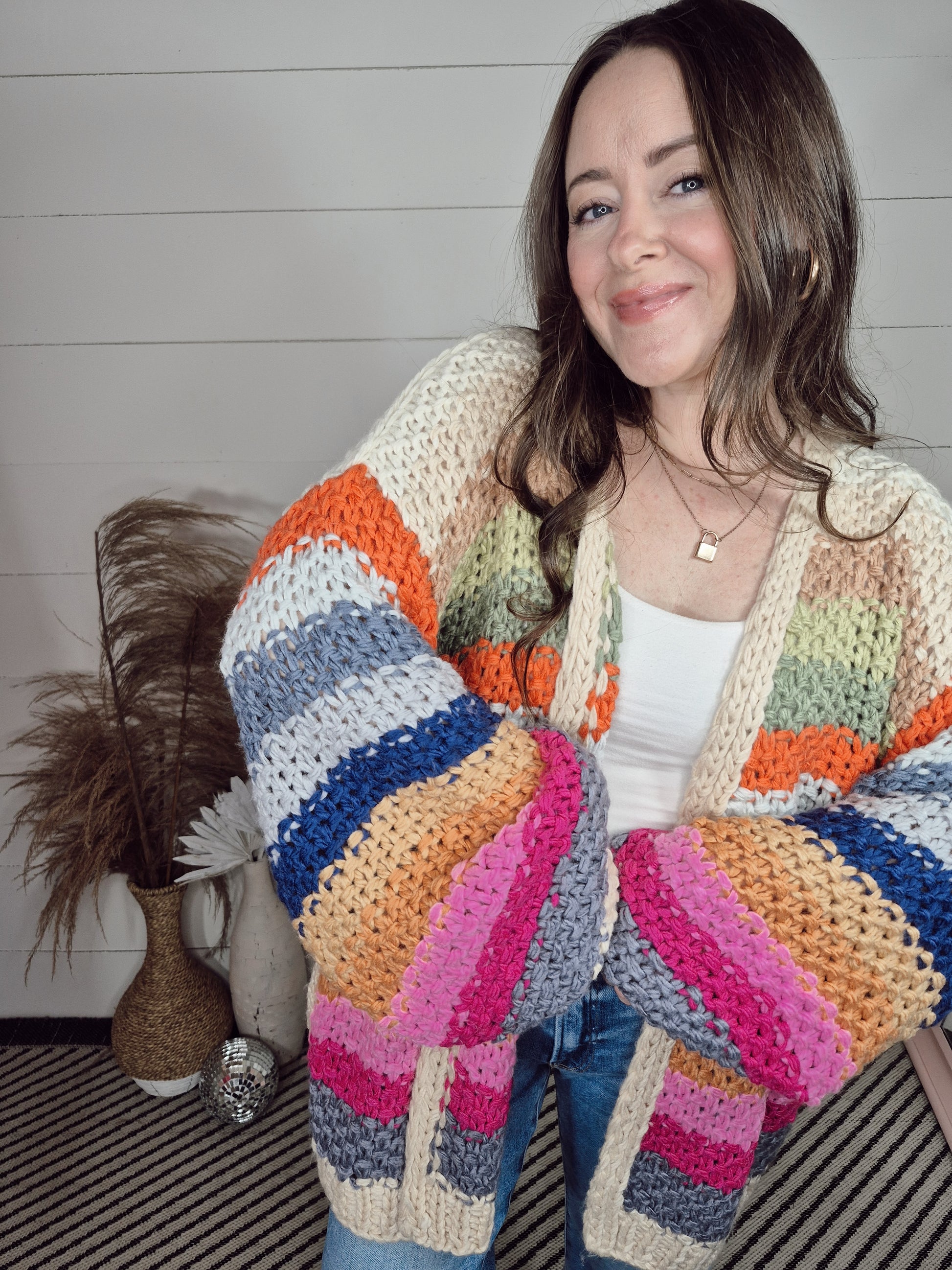 Get ready to turn heads with the *NEW* Colors Of The Rainbow Cardi! This bright, fun standout piece is like a party for your wardrobe (confetti optional)! Uniquely designed to spice up any outfit, it’s your ticket to rainbow-powered pizzazz. Who knew chasing rainbows could be this stylish?