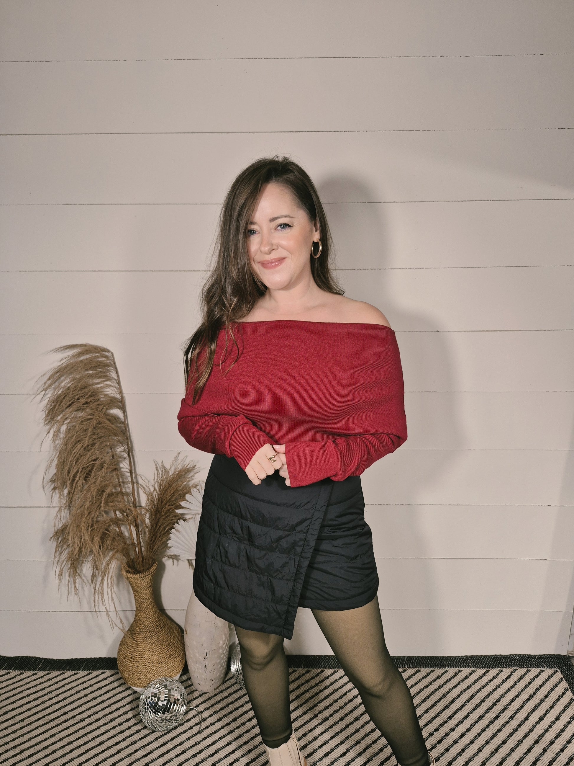 Get ready to turn heads with our *NEW* Taking Chances Off Shoulder Sweater! This sassy and sexy sweater is a stand out piece that is perfect for any holiday event. Show off your playful and confident side in this must-have sweater. Don't miss your chance to make a statement!